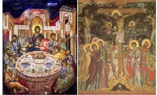 Κατόπιν πήρε ψωμί στα χέρια Του και είπε: «Λάβετε φάγετε». Το ίδιο έκανε και με το ποτήρι του κρασιού λέγοντας: «Πιέστε απ' αυτό όλοι, γιατί αυτό είναι το αίμα Μου, της νέας Συμφωνίας. Αυτό να κάνετε για να Με θυμάστε». Μετά από αυτή τη στιγμή ο Ιούδας, μόλις έφαγε τον άρτο έφυγε και συμφώνησε με τους αρχιερείς να τους Τον παραδώσει.