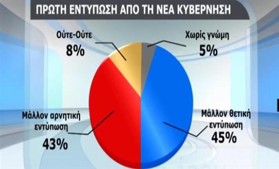 Σύμφωνα με νέο βαρόμετρο της Public Issue για την Καθημερινή το 45% των ερωτηθέντων δηλώνει πως έχει διαμορφώσει θετική εντύπωση, ενώ το 43% έχει σχηματίσει αρνητική εντύπωση.