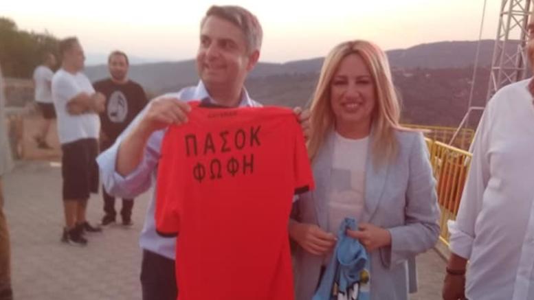 Της προσέφεραν και μία φανέλα του Αστέρα Τρίπολης, την οποία και φόρεσε χαμογελώντας, καθώς στην πίσω πλευρά η φανέλα έγραφε «ΠΑΣΟΚ Φώφη».