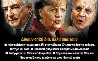 Μαχαίρι στον 13ο και 14ο μισθό στον δημόσιο τομέα, αλλά και στη 13η και 14η σύνταξη τόσο στον ιδιωτικό όσο και τον δημόσιο τομέα, νέες αυξήσεις σε ΦΠΑ, καύσιμα, τσιγάρα και ποτά, αύξηση του ορίου απολύσεων και κατάργηση των συλλογικών συμβάσεων εδώ και τώρα απαιτεί η «τρόικα» Ε.Ε...