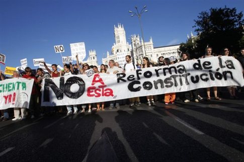 Εκατοντάδες άνθρωποι, οι οποίοι προέρχονταν κυρίως από το κίνημα των «Αγανακτισμένων», διαδήλωσαν την Κυριακή στη Μαδρίτη εναντίον ενός σχεδίου συνταγματικής μεταρρύθμισης, το οποίο καθιερώνει έναν «χρυσό κανόνα» δημοσιονομικής σταθερότητας. Οι διαδηλωτές ζήτησαν τη διεξαγωγή δημοψηφίσματος για το θέμα.